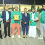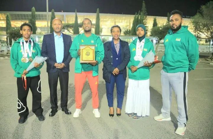ብሔራዊ ቡድኑ ቦሌ አለም አቀፍ አየር መንገድ ሲደርስ በባህልና ስፖርት ሚኒስቴር የስፖርት ልማት መሪ...