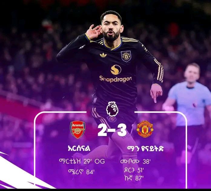 ማሻ፤ ጥር 18/2018 ዓ/ም (ማሻ ኤፍ ኤም 103.8) በ23ኛ ሳምንት የእንግሊዝ ፕሪሚየር ሊግ ጨዋታ ማንቼስተር ዩናይትድ አርሰናልን 3 ለ 2 አሸንፏል።